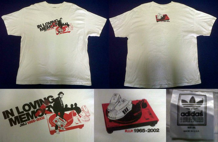 เสื้อ Adidas RUN DMC ทำเป็นที่ระลึกให้กับ JMJ ผู้จากไป สกรีนลายหน้าหลัง สีขาว สภาพดี อก24 ยาว28ไซท์ 2XL เอาไปแก้ไซท์ได้ตามใจ Made in USA ราคา 400 บาท