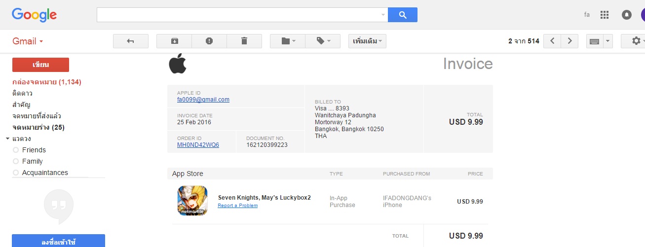 invoice จาก apple ที่ส่งเข้าอีเมล์ ของตัวละคร saimensi