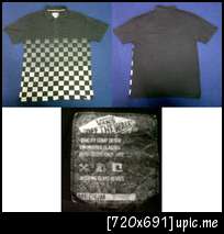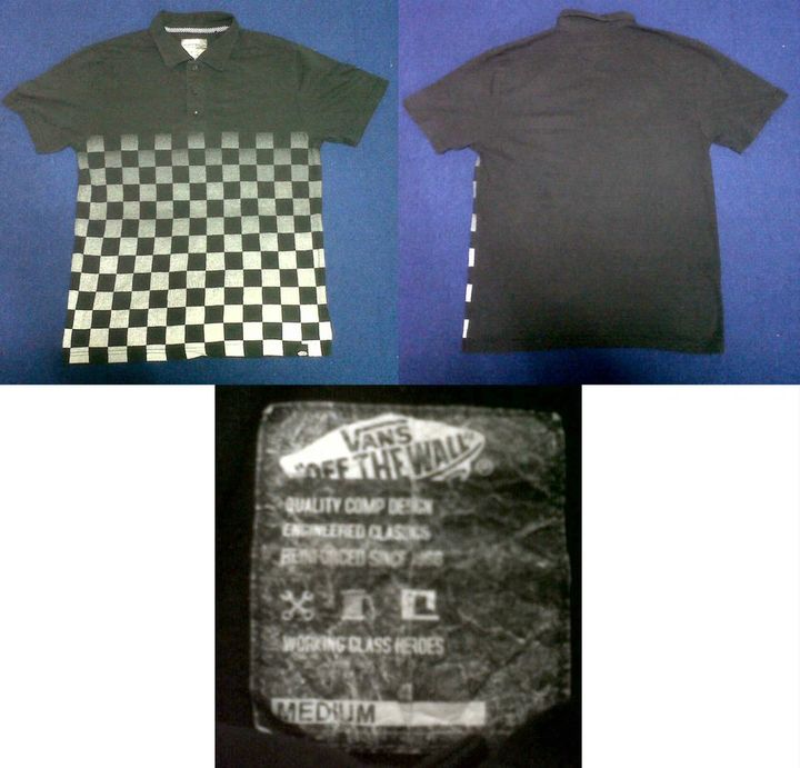 เสื้อคอปก Vans สกรีนลายหมากรุกครึ่งตัวเต็มๆด้านหน้าด้านเดียว สีดำ ไซท์ M ขนาด อก21 ยาว27 สภาพ 80% ราคา 400 บาท